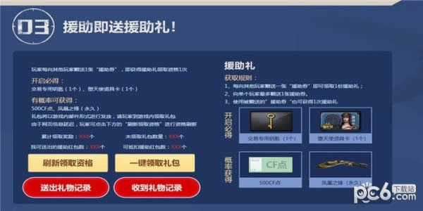 1、每向其他玩家赠送一张“援助券”即可领取1份援助礼;