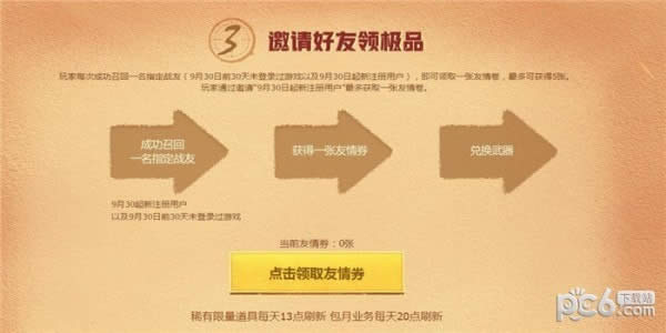 2.玩家每次成功召回一名指定战友(9月30日前30天未登录过游戏以及9月30日起新注册用户),即可领取一张友情卷,最多可获得5张。玩家通过邀请“9月30日起新注册用户”最多获取一张友情卷。