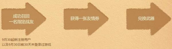 玩家每次成功召回一名指定战友(9月30日前30天未登录过游戏以及9月30日起新注册用户),即可领取一张友情卷,最多可获得5张。
