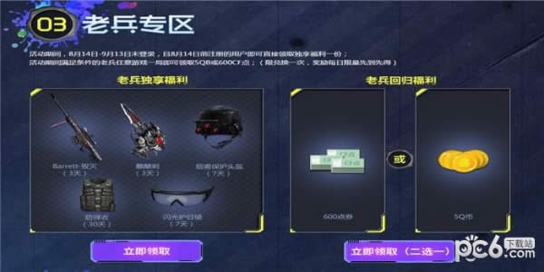 3.活动期间满足条件的老兵任意游戏一局即可领取5QB或600CF点;(限兑换一次,奖励每日限量先到先得)