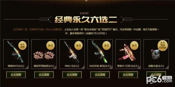 【1】当天游戏一局,玩家即可任选一件永久武器领取,之后加入任意一局 “新生存竞技” 或 “团竞歼灭”