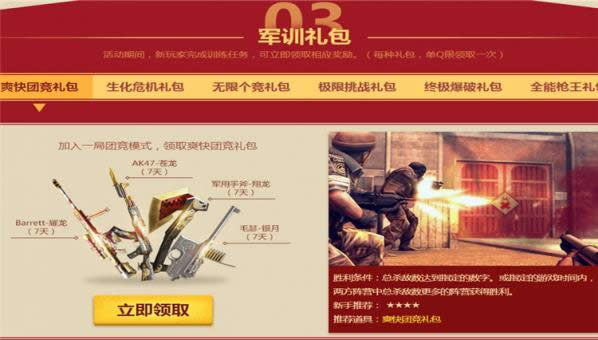 活动期间,新玩家完成训练任务,可立即领取相应奖励。(每种礼包,单Q限领取一次)