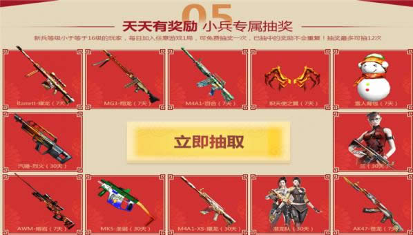 新兵等级小于等于16级的玩家,每日加入任意游戏1局,可免费抽奖一次,已抽中的奖励不会重复!抽奖最多可抽12次
