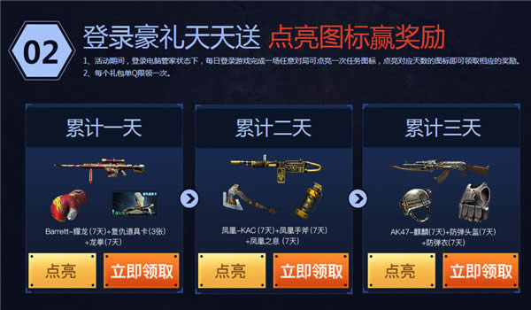 2、活动期间,登录电脑管家状态下,每日登录游戏完成一场任意对局可点亮一次任务图标,点亮对应天数的图标即可领取相应的奖励。每个礼包单Q限领一次。