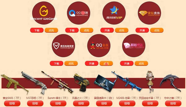 活动期间,用户每点亮一个特权图标,即可领取1件装备,每件装备最多领取1次。