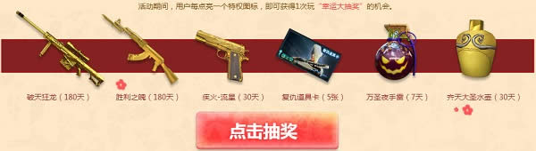 每日加入任意一局游戏,可立即打开1个神枪节宝箱。每日限开1次。打开宝箱将随机获得不同期限道具,如未获得道具,将获得200火线币。