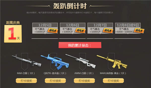 3.倒计时期间,每天登录可获得当天的暴击卡,并可在4个道具中打卡选取1个,每个道具只可获得1次