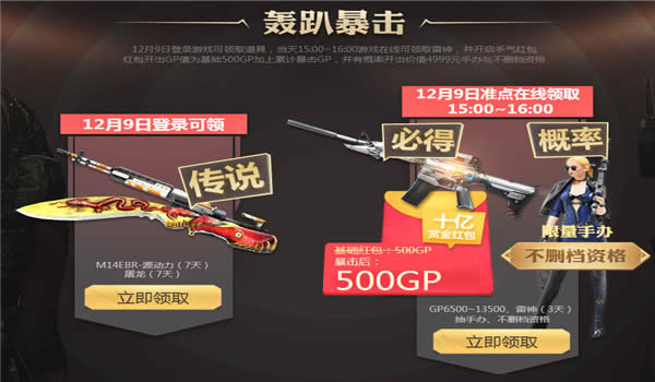 4.12月9日登录游戏可领取道具,当天15:00~16:00游戏在线可领取雷神,并开启手气红包红包开出GP值为基础500GP加上累计暴击GP,并有概率开出价值4999元手办与不删档资格