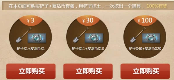 在本页面可购买铲子+复活币套餐,用铲子挖土,一次挖出一个道具, 100%有奖
