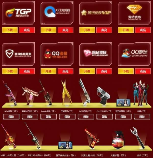 活动期间,用户每点亮一个特权图标,即可领取1件装备,每件装备最多领取1次。