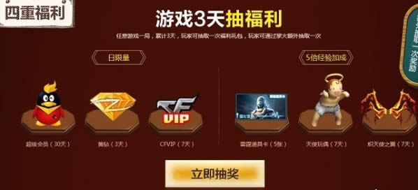 任意游戏一局,累计3天,玩家可抽取一次福利礼包,玩家可通过掌火额外抽取一次。