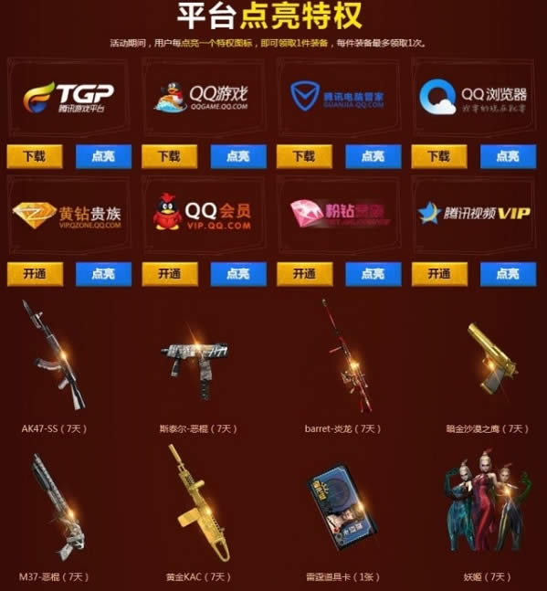 活动期间,TGP平台用户来到页面即可直接领取一份TGP平台专属特权奖励,每个QQ号仅限领取一次!