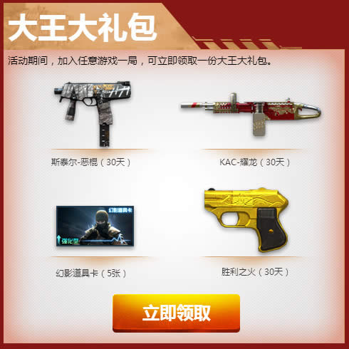 活动期间,加入任意游戏一局,可立即领取一份大王大礼包。