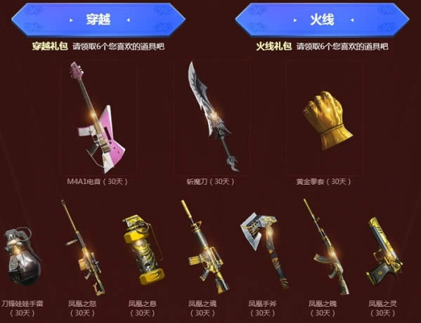 8月5日、8月6日,任意一天,加入任意一局游戏,(1小时后)可立即英雄级武器9选6。每个QQ号活动期间仅限领取一次。