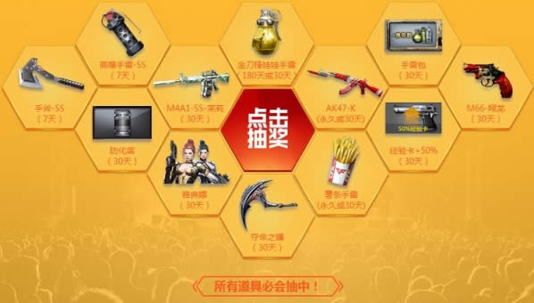 玩家每抽抽奖一次,抽到的道具即从奖池中消失。所有道具必会抽中!玩家每天均能免费抽奖一次,之后加入任意一局游戏,可以再次抽奖一次。(每天最多两次)玩家通过掌火可额外获得一次抽奖机会。