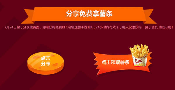 7月24日起,分享此页面,即可获得免费KFC宅急送薯条券1张(24小时内有效),每人仅限获得一份,请及时使用哦!
