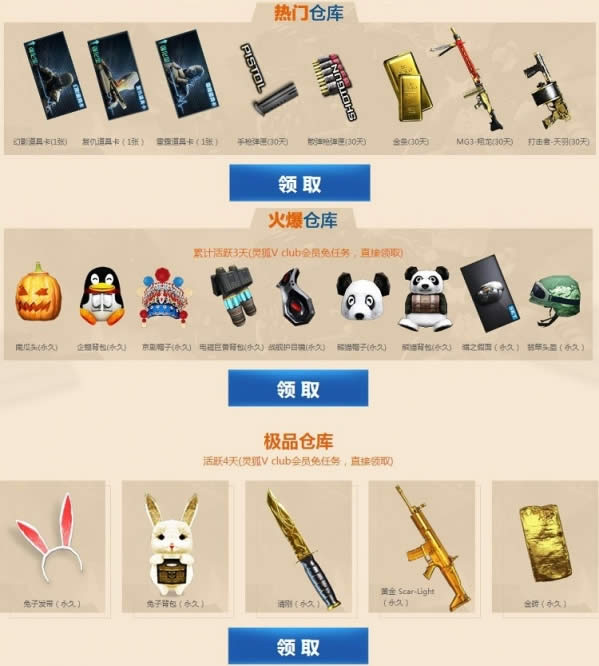 活动期间,每日任意加入游戏一局,即可领取热门仓库所有道具奖励(每种礼包单Q限领取1次)