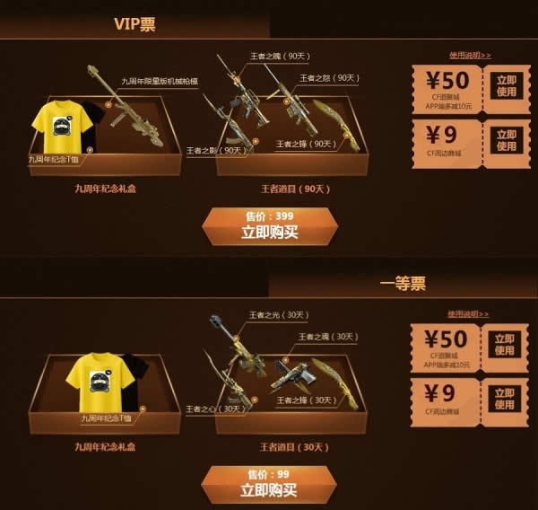 A:VIP票、一等票需要玩家自行购买,票价分别为399元及99元。购买后可获得CF九周年纪念道具礼盒(精美周边+豪华道具)。不同价位的门票所对用的礼盒内容也将有所不同。而幸运票可通过”掌上穿越火线“APP免费获取!