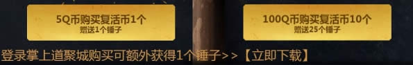 1. 5Q币购买复活币1个可获得锤子1个,100Q币购买复活币10个可获得锤子25个;