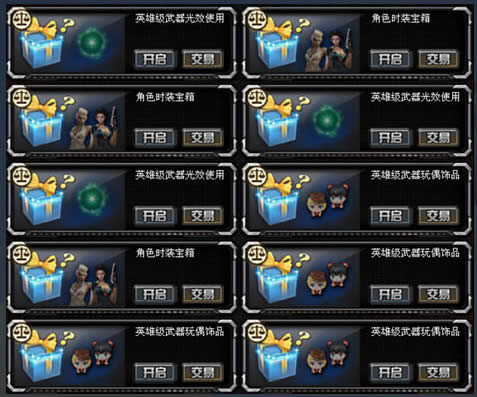 随机宝箱专属与交易所系统,登录游戏、游戏在线、完成游戏结算时有几率获得随机宝箱。获得的随机宝箱或宝箱内道具可以在交易所进行拍卖。