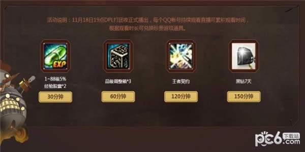 预约观看DPL打团夜的玩家可获得黑钻七天奖励,11月18日19点观看DPL打团夜的玩家,每观看一分钟可兑换一积分,积攒积分可兑换奖励。30积分可兑换1~88级5%经验胶囊*2,60积分可兑换品级调整箱*3,120积分可兑换王者契约,150积分可兑换黑钻7天。