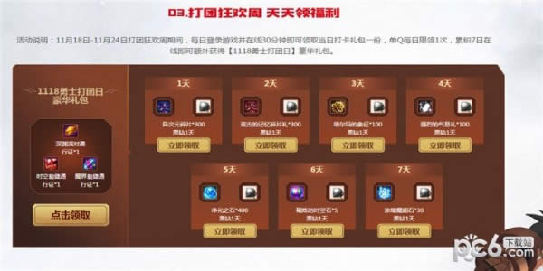 除此以外,每日签到活动同步开启,根据签到时间不同,玩家都可以获得相应的奖励。对应奖励为:Day1-黑钻1天+异次元碎片礼盒(300个)Day2-黑钻1天+荒古的记忆碎片礼盒(300个)Day3-黑钻1天+塔尔玛的象征礼盒(100个)Day4-黑钻1天+强烈的气息礼盒(100个)Day5-黑钻1天+净化之石(400个)Day6-黑钻1天+精炼的时空石(5个)Day7-黑钻1天+浓缩魔能石(30个)。完成7天签到后将获得“1118勇士打团日豪华打团礼包”专属奖励,获得深渊派对通行证1个+时空裂缝通行证1个+魔界裂缝通行证1个。