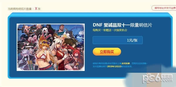 双十一限量明信片1元每件,每购买一张明信片可获得一次抽奖机会,明信片购买时无需支付邮费,购买后需点击按钮支付15元运费并填写寄送地址,我们将在2019年1月1日前按照订单先后顺序为您发货,未支付邮费并填写地址的玩家视为自动放弃明信片获取资格,我们将无法为您发货;