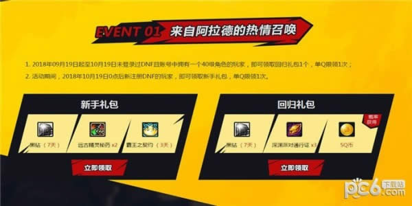2.活动期间,2018年10月19日0点后新注册DNF的玩家,即可领取新手礼包,单Q限领1次。