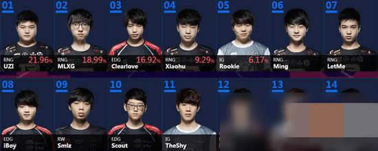 按照排名顺序分别是,1、UZI,2、MLXG,3、Clearlove,4、Xiaohu,5、Rookie