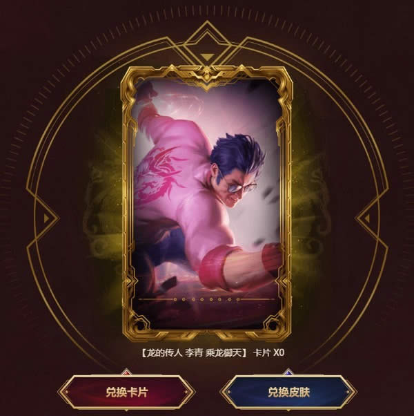 A:在某个特定的大区拥有龙的传人 李青皮肤,即可兑换1张 龙的传人 李青 卡片,每个大区仅限兑换一次。