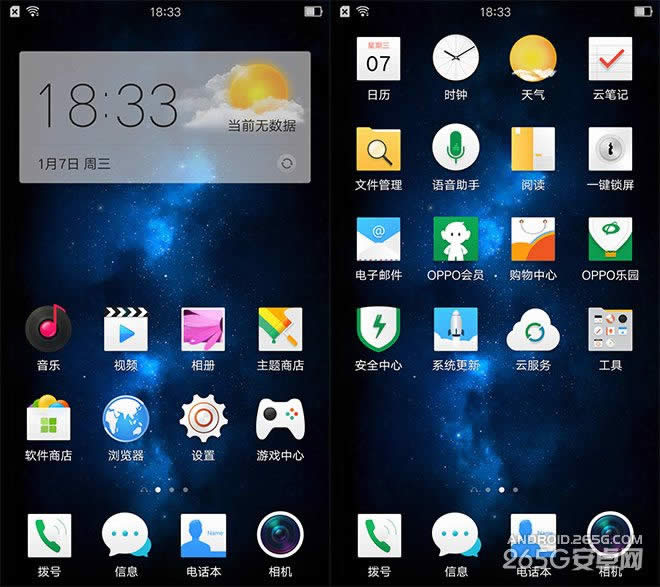 OPPO R7内置了诸如天气、音乐、视频、相册、主题商店、软件商店、浏览器、相机、安全中心等最基本的应用,这些内置应用基本上也都涵盖了大部分用户日常所经常用到的功能,所以就算是从未接触过ColorOS系统的用户,在使用OPPO R7时也不会感到无从下手。