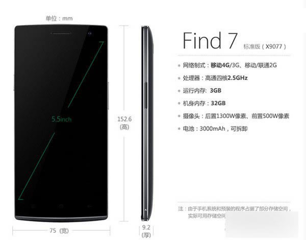 OPPO Find 7 配备5.5英寸2K屏,支持 VOOC 闪充(5分钟充电维持2小时通话),高通801四核2.5GHz处理器、3GB内存、1300万/500万像素摄像头、3000mAh电池(可拆卸)、支持移动4G/3G和移动/联通2G。
