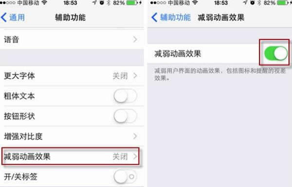 返回设置界面后不管是设置菜单还是桌面效果,此时都已呈灰度显示。经过测试,开启“灰度”选项之后,每分钟的耗电量百分比相对未开启时减少33%,如果没有运行大型的后台程序,省电效果更明显。另外,在“辅助功能”下,打开“减弱动画效果”开关,也能让iPhone运行得更久。