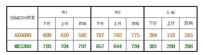 其实这项可以看作是测试MU-MIMO,只是,就算是华硕AX89X这种8x8mimo的WIFI6无线路由器,也不能让多台AX200运行在MU-MIMO模式下。从上表中可以看出,同是WIFI6的5G1,MX5300的4x4mimo会比AX6600的2x2mimo并发数据要高些;5G2,因为MX5300只是WIFI5芯片,所以在速率上输给了WIFI6,因而5G2的数据会比AX6600低;2.4G方面,不知怎么的,上行明显比MX5300慢。