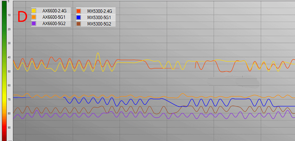 在C点位置,MX5300的2.4G比AX6600强一点,5G1还是AX6600强,5G2也是AX6600强一些,不知道是哪台干扰了哪台,AX6600的5G波动满园比较大,特别是5G2。