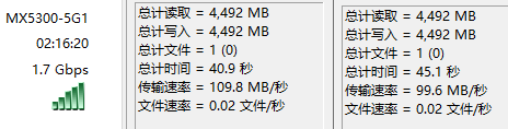 5G1,近距离下MX5300容易达到千兆网口的极速,AX6600测试多几次也是不太稳定,但是也能超过100MB/秒的传输速度,总觉得AX200的问题多多,AX6600不该有这样的表现。