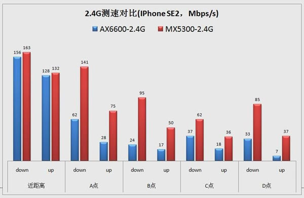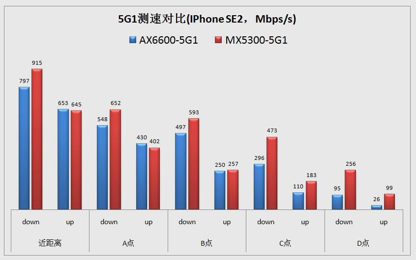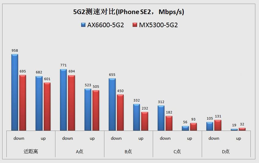 MX5300在5G2的测速上,输在不支持WIFI6上,但楼下D点位置,两者差不多。从5G2测速上可以看出,你把手里的WIFI5路由换成WIFI6路由之后能带来的提升有多少。