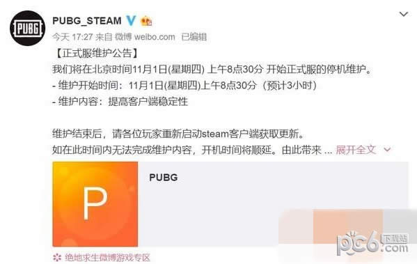 总结:绝地求生将于11月1日上午8点30分开始正式服的停机维护,预计3小时,请大家注意时间哟~