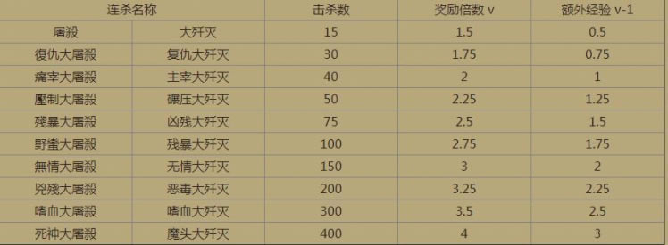 过于复杂的理论不多描述,下面给出一张连杀倍率与数量的表格。