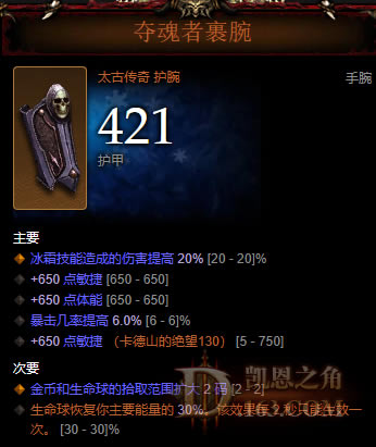 护腕我选择了灵魂守卫,因为悬赏经常要顶着怪物开灵光悟读条,这时候多一条减伤可以不出春哥。你可以换成其他的护腕,比如夺魂者裹腕(图纸杀第五幕BOSS马萨伊尔拿)。