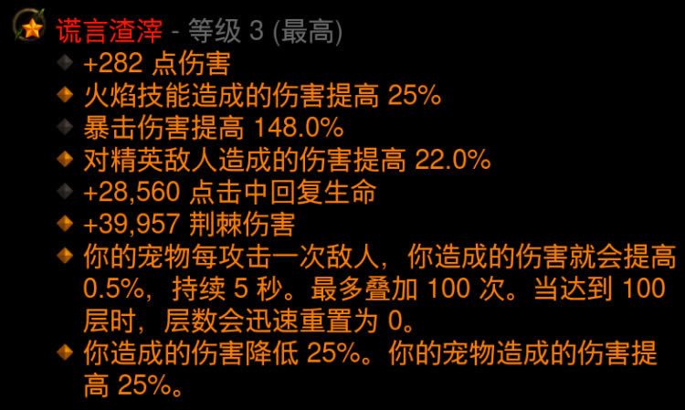 每有一个技能处于冷却状态,你的攻击速度和暴击几率就会提高5%。 你的宠物每攻击一次敌人,你造成的伤害就会提高0.5%,持续5秒。最多叠加100次。当达到100层时,层数会迅速重置为0。