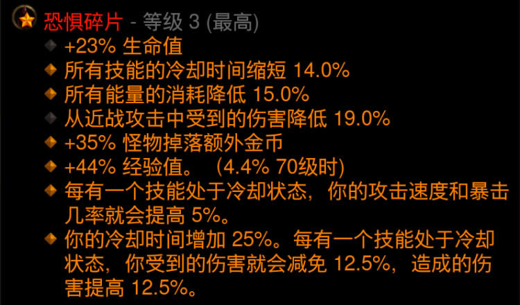 3. 关于恐惧碎片3级特效的选择,有两种可行,一是CD加攻速暴击,二是50%火电伤。