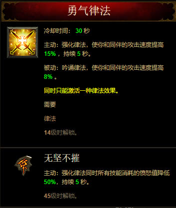 旅者套的技能也比较随意,严格来说只需要天拳、律法、阿卡、战马冲锋和钢甲5个久足够了,第六个技能位置琉璃选了天罚之剑用于越地形。