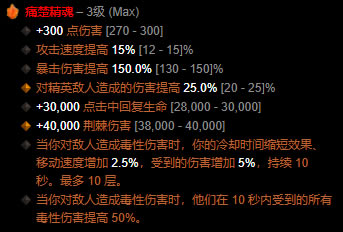 武器则选择痛楚精魄,2级词缀选攻速、闪电伤害或者爆击,三级威能三个都可以。