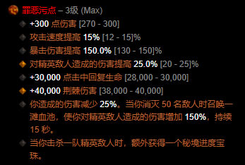 额外的,因为我们是杀精英为主的玩法,所以你也可以选择罪恶污点,三级威能选择额外进度球,这样打低层与小秘境速刷的时候可以更效率的通关。