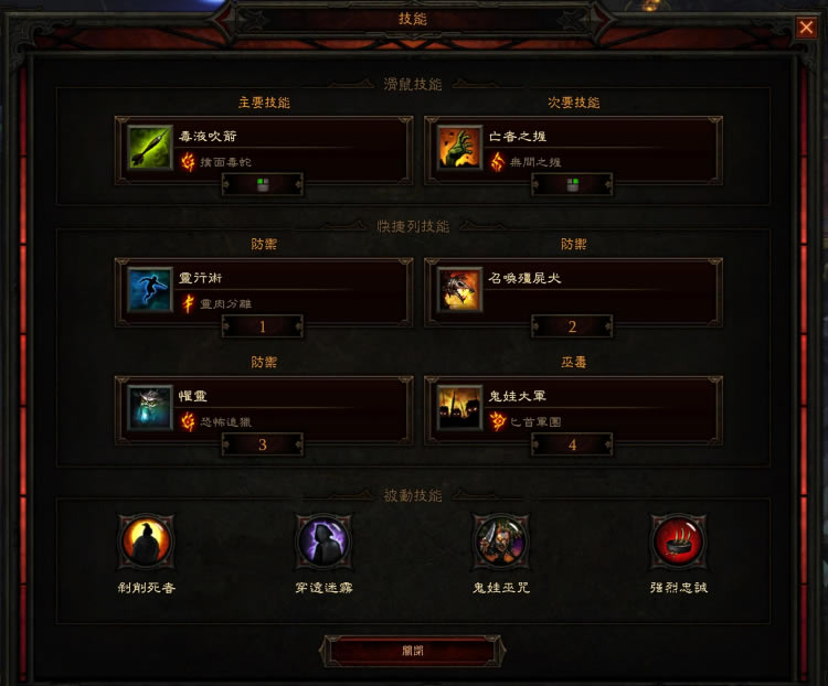 下图是我过精通时的技能,因为怪物分散,且要求远程输出,灵魂收割基本无用,所以我选了狗,同时套装地下城无需假死,因此可以把假死换成狗加速