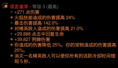 特别说明:谎言渣滓之所以选择杀精英怪减CD的特效,是因为这个特效不仅对黄精英和蓝精英生效,同时对黄精英带的爪牙也生效,也就是每击杀一个爪牙,也能减5秒CD时间,实乃神器!