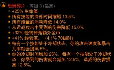 为什么恐惧碎片三级特效选择加攻速暴击而不是加火电元素伤,一是为了更快的打拳,快速攒内力触发神龙特效。二是攻速和暴击都直接作用于面板伤害,火幻身爆炸伤害直接跟面板伤害挂钩,这个在上赛季已有定论。综合来看个人觉得攻速暴击效果更佳,但这不是硬性标准,带什么宝石请根据自身喜好进行取舍。但谎言渣滓一定是选择火伤和减CD。