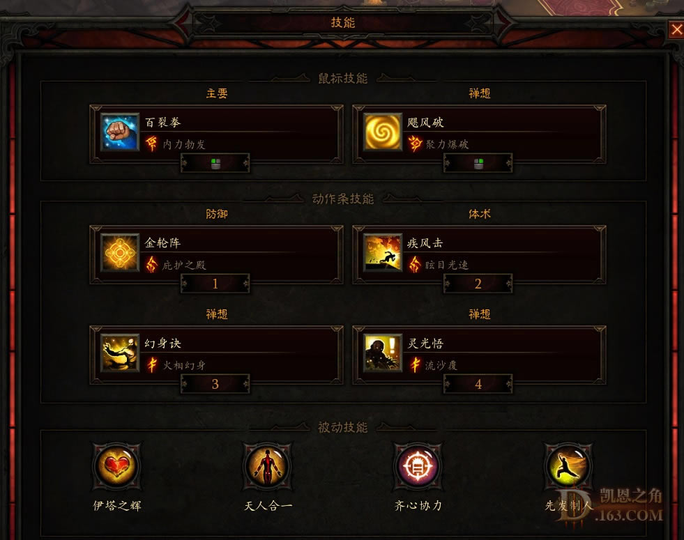 技能和被动如上,值得说的是为啥带灵光悟和金轮阵。这是因为在卡住小键盘或者用宏的情况下,可以保证这两个技能一直处于CD状态,加上幻身诀,可以保证火人在爆炸时有三个技能处于CD状态,以保证伤害最大化。