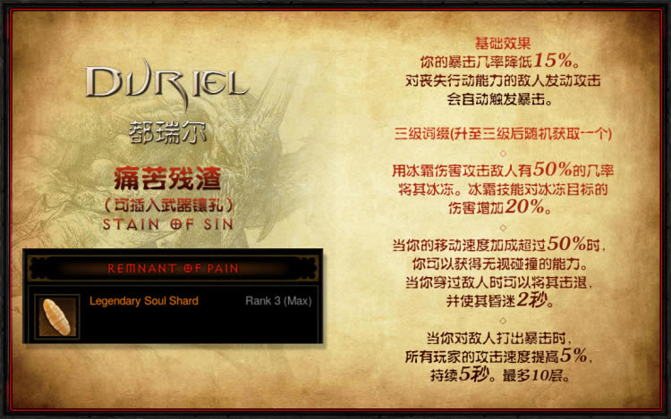 传奇特效:你的憎恨生成技可使你受到的伤害降低 (40-50)% ,持续 5 秒。